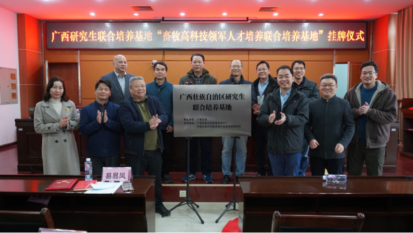 本次活动还举行了广西研究生联合培养基地“畜牧高科技领军人才培养研究生联合培养基地”挂牌仪式。该联合培养基地由龙8long8手机登录牵头,广西壮族自治区畜牧研究所和中国农业科学院深圳基因组研究所作为合作单位,三方共同合作建设,针对广西现有的经济特点和区位优势,做好对研究生的培养工作,为广西的畜牧业发展建设培养高科技领军人才,引领畜牧业发展。挂牌仪式后双方专家就广西畜牧业发展和人才队伍建设进行了座谈交流。陆阳清教授首先就龙8long8手机登录的人才培养优势和项目资源做了相关介绍,广西畜牧研究所所长吴柱月研究员也介绍了广西畜牧研究所的基本情况。双方就利用好优势资源,充分发挥畜牧高科技领军人才培养研究生联合培养基地的作用,实现共赢发展,同时为自治区经济发展贡献力量,助力国家乡村振兴。