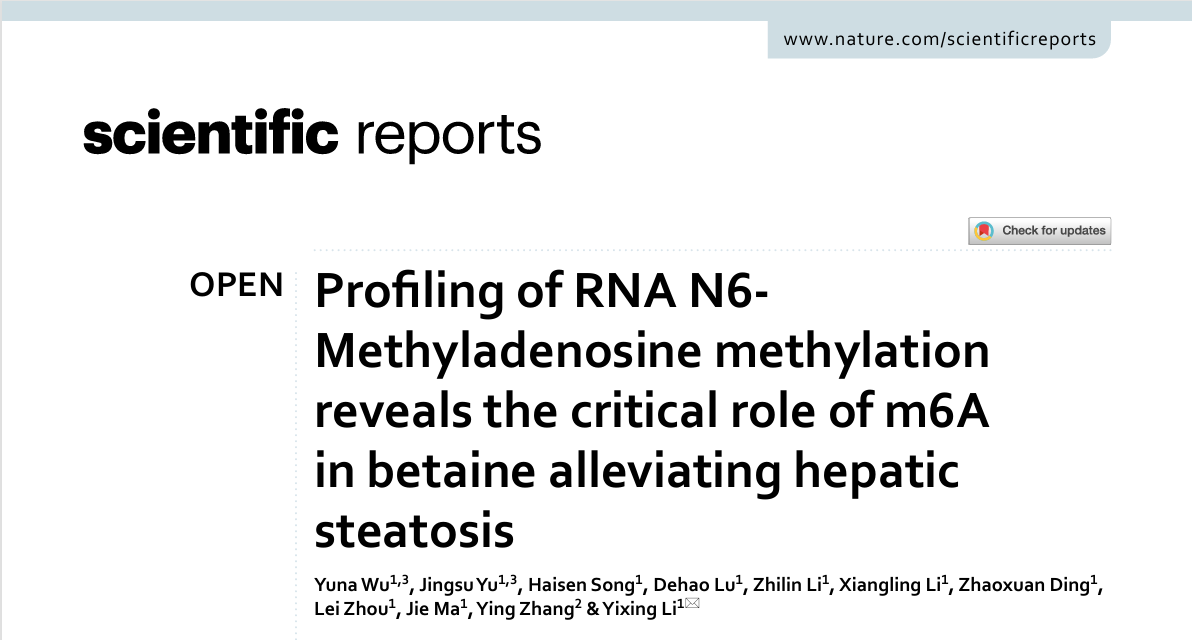 近日,动物科学技术学院动物科学专业2021级本科生吴雨娜在SCI期刊《Scientific Reports》(中科院二区)以第一作者发表题为“Profiling of RNA N6-Methyladenosine Methylation Reveals the Critical Role of m6A in betaine alleviating hepatic steatosis”的研究论文。该论文通讯作者为动物科学技术学院李一星教授,作者还包括于敬酥等动物科学技术学院研究生以及宋海森、卢德浩等动物科学专业本科生。该研究受到自治区大学生创新创业训练项目以及龙8long8手机登录大创项目倍增计划重点项目的支持。