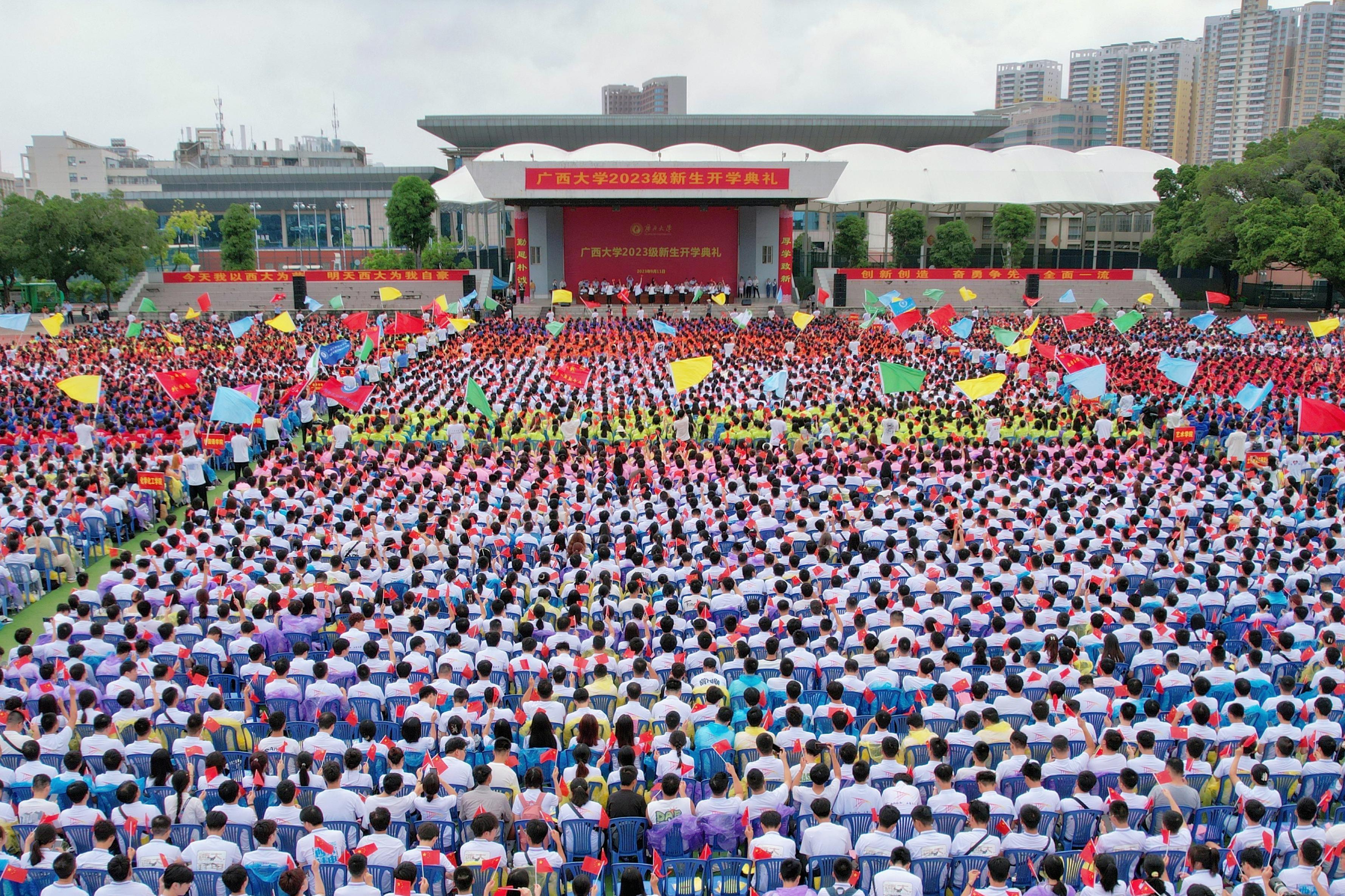 韩林海校长作题为《描绘青春“三原色”争做最美“西大人”》的讲话,向新同学们提出了殷切的期望。他用出征2023年摔跤世青赛并夺得金牌的李彦蓉同学,参与研发国内首个公路工程管理信息系统、曾获广西“十百千”知识产权实用人才的谢灿荣同学等西大榜样学子勉励同学们要自信地拿起手中画笔,用好红黄蓝“三原色”,用德智体美劳的全面进步创作出属于自己大学生涯的精彩画作。以理想信念为笔,绘出赤诚热烈的红色。遵循首任校长马君武“保卫中华,发达广西”的办学宗旨,传承我校杰出校友、“两弹一星”功臣党鸿辛学长的家国情怀,用一生践行科技报国的初心,坚定理想信念,时刻与祖国同频共振,主动把小我融入大我,努力成为爱党爱国、坚定理想、勇担使命的最美“西大人”;以认真扎实为笔,绘出质朴敦厚的黄色。牢记“勤恳朴诚,厚学致新”校训,学习自治区“八桂楷模”、土木建筑工程学院教授、中国工程院郑皆连院士50年如一日地潜心思考和钻研大跨拱桥,多次刷新拱桥跨度世界记录,天天做功、久久为功、持之以恒,锤炼本领、丰富学识、提升自我。如同稻谷“扎根、破土、拔节、抽穗”一样逐渐走向成熟,努力成为在“扎根”中夯实本领,在“破土”中埋头苦干,在“拔节”中寻求突破,在“抽穗”中担当作为的最美“西大人”;以求真思辨为笔,绘出严谨理性的蓝色。学习资源环境与材料学院潜心科研攻关,成功制备出纯度达到7N级以上的高纯镓产品。学习物理科学与工程技术学院主导研制X射线偏振探测立方星发射升空,空间飞行验证取得圆满成功的创新精神,以与时俱进的精神、革故鼎新的勇气、坚韧不拔的定力,努力成为有创造性思辨能力,敢于追求真理、勇于开拓创新的最美“西大人”。