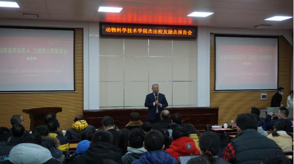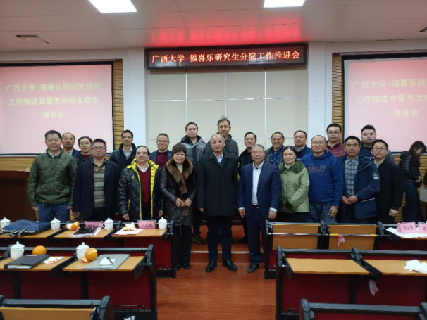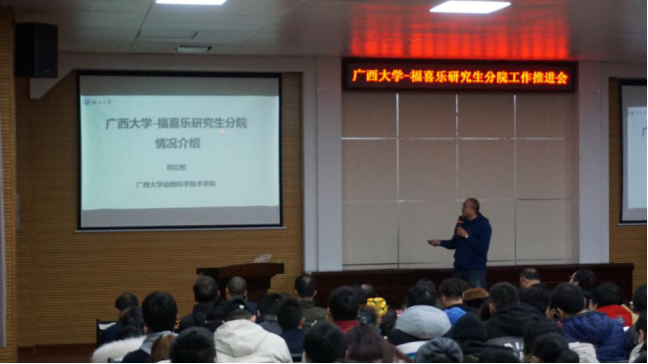2021年1月8日,为推动龙8long8手机登录-福喜乐研究生分院工作进行,深化“产教融合”创新研究生培养体系建设,我校冯家勋副校长、研究生院蒋艳明副院长、科技处黄大安主任、顾慕娴书记、陆阳清副院长、司红彬副院长及动物科学技术学院的部分老师、研究生,福喜乐公司黄定寿董事长、黄定雄总经理、马晓主任等参加了在动物科学技术学院举办的龙8long8手机登录—福喜乐研究生分院工作推进会,校友黄定寿先生做了爱农务农励志报告会。